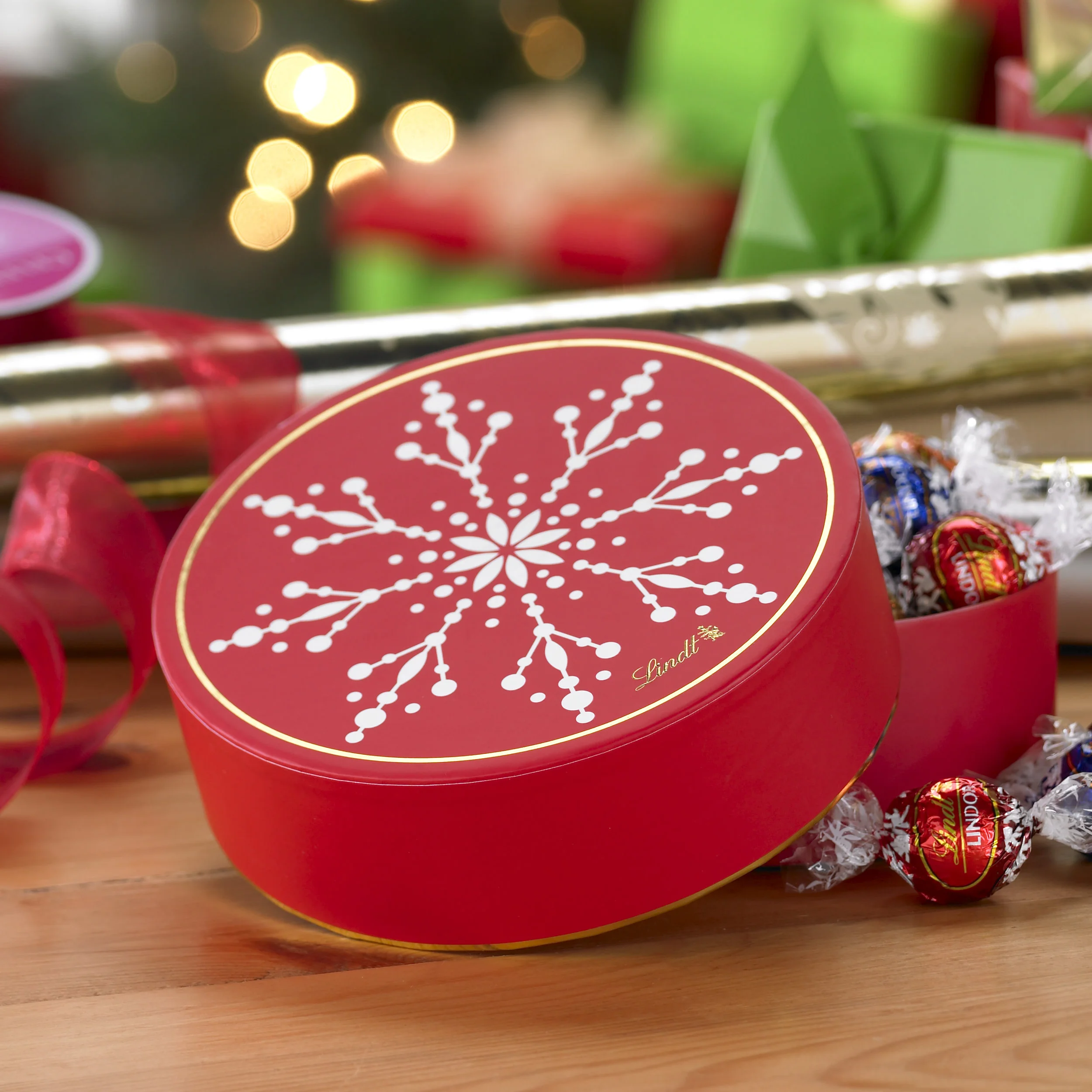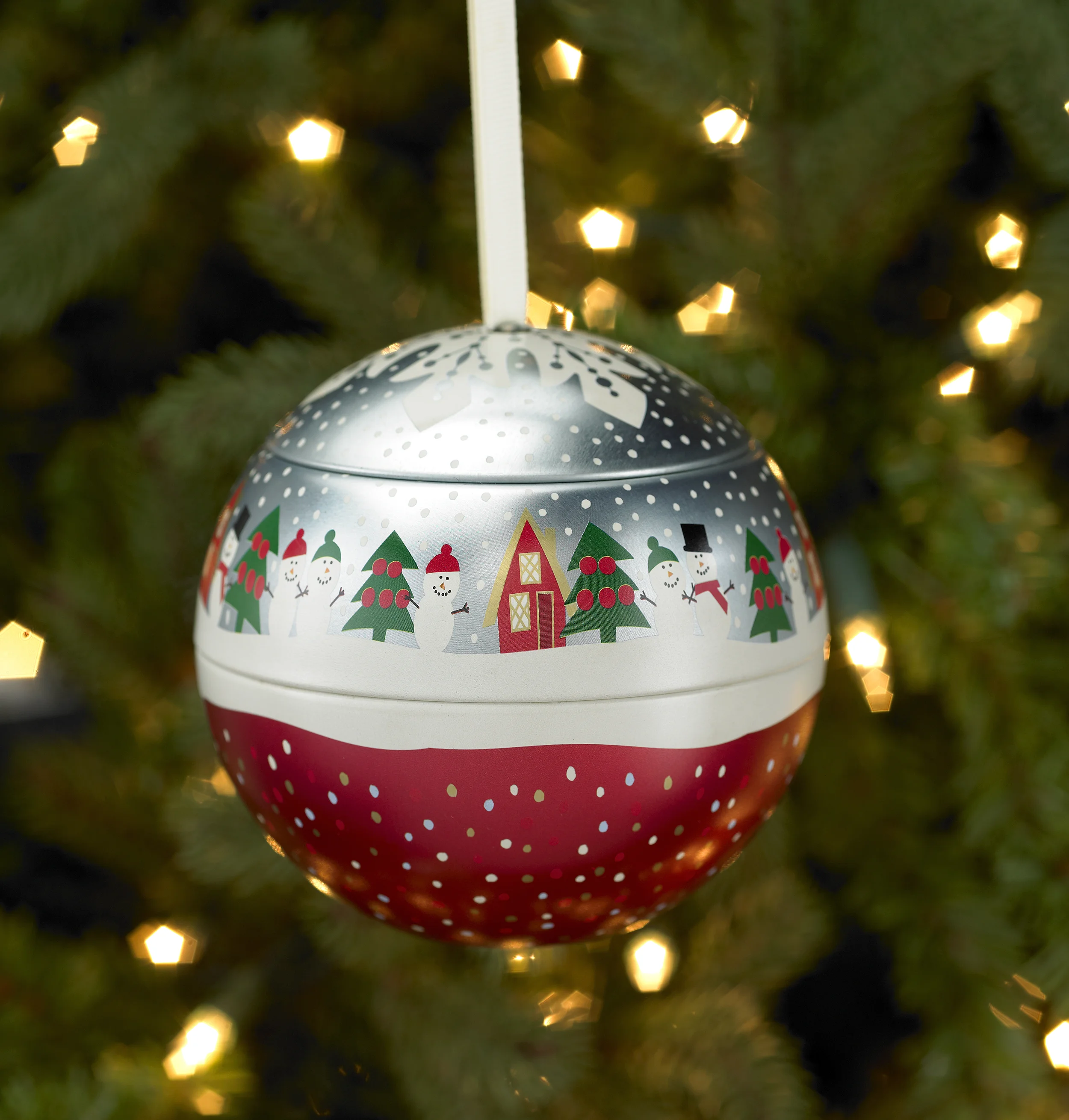 Illustrated surface of round tin for holiday season.