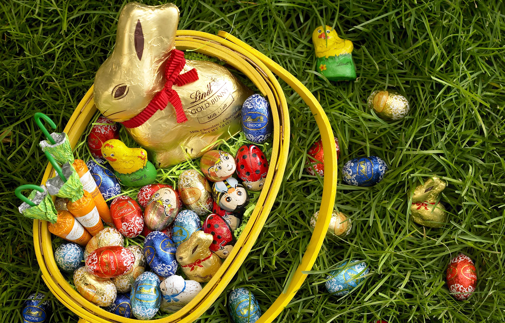 Show variety of Lindt Chocolate novelties in use during traditional Easter hunt.